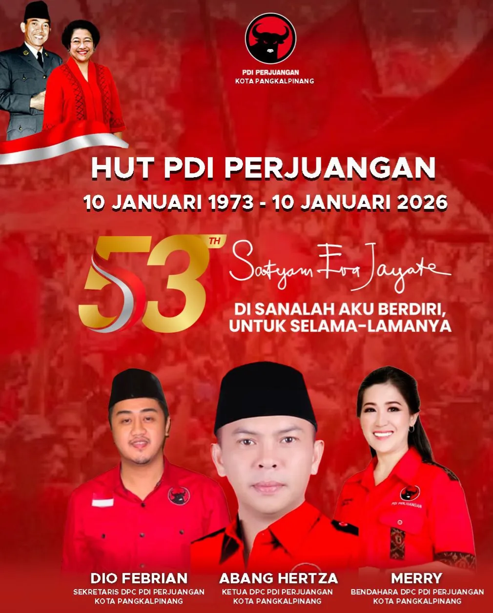 Seputarbabel.com, Pangkalpinang – 53 tahun PDI Perjuangan, dirayakan dengan rapat kerja nasional (Rakernas), 10 – 13 Januari 2026. Diawali launcing Barata sebagai maskot, dibuka dengan orasi politik Ibu Bangsa, Ketua Umum PDI Perjuangan, Megawati. Bagi kader PDI Perjuangan di Provinsi Kepulauan Bangka Belitung (Babel). Umur partai hari ini adalah perjalanan panjang pengabdian, bersama rakyatnya dengan gotong royong.