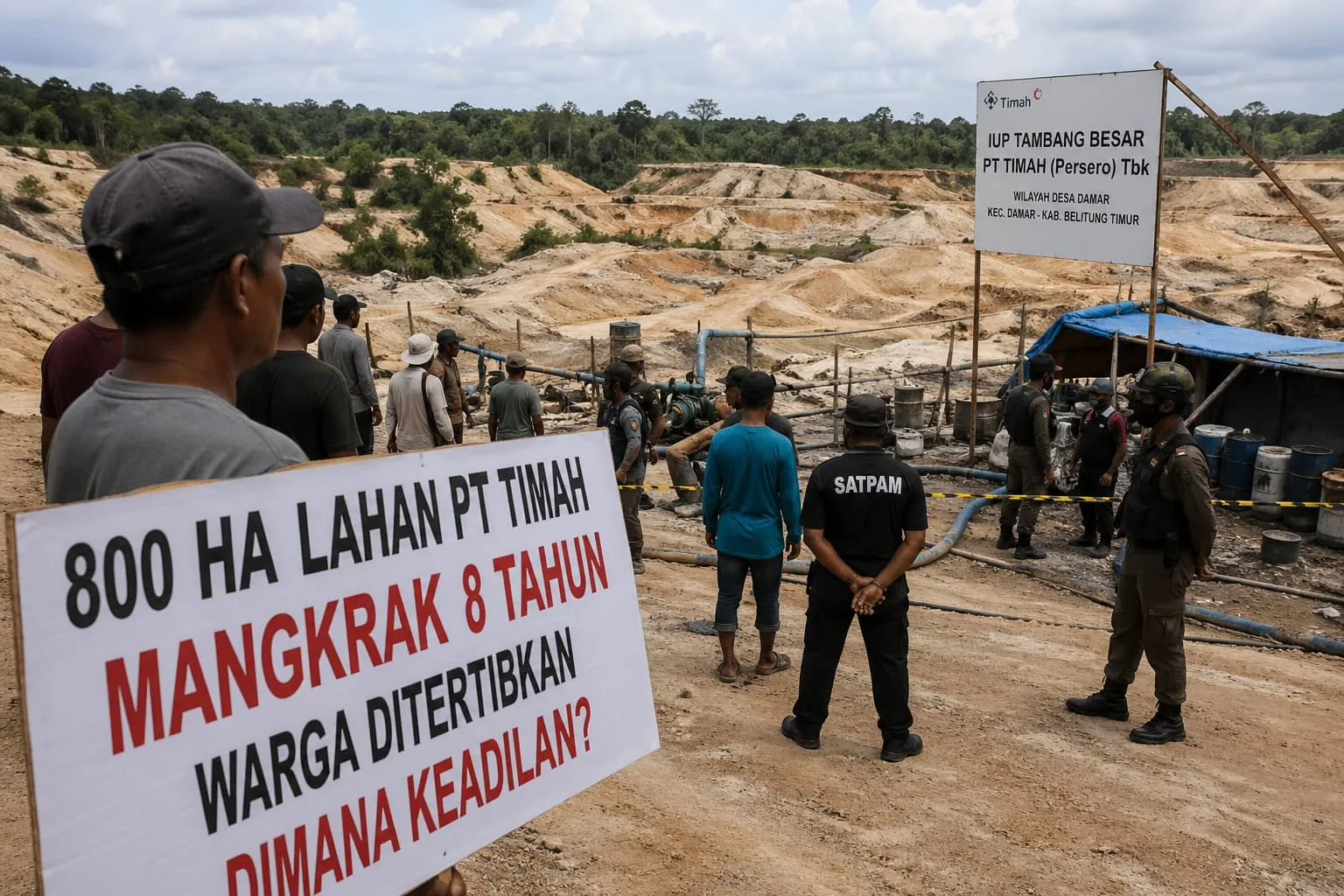 BELITUNG TIMUR, SEPUTARBABEL.COM – Warga Desa Damar, Belitung Timur geram. Lahan 800 hektar IUP Tambang Besar milik PT Timah Tbk mangkrak sejak 2018 tanpa aktivitas produksi. Ironisnya, warga yang menambang di bekas galian reklamasi justru ditertibkan Satpam PT Timah.