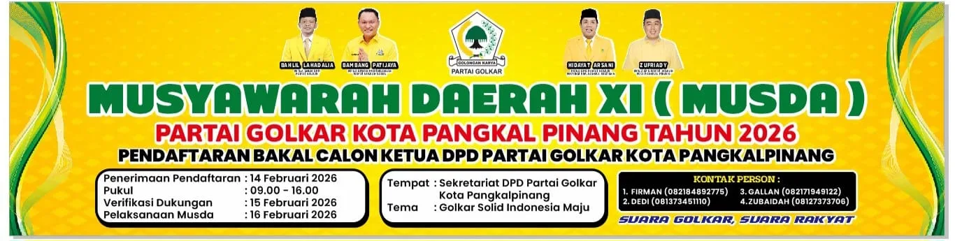 Seputarbabel.com, Pangkalpinang – Panitia Musyawarah Daerah (Musda) XI Partai Golkar Kota, Jumat (13/2/2026) sore menggelar rapat bersama. Berlangsung lebih dari satu jam, rapat berhasil menyepakati 2 keputusan. Batas waktu dan tempat pendaftaran serta Hotel Cordela sebagai lokasi pelaksanaan Musda. Tempat pendaftaran di Sekretariat DPD II Partai Golkar, Sabtu (14/2/2026) hingga pukul 00.00 WIB.