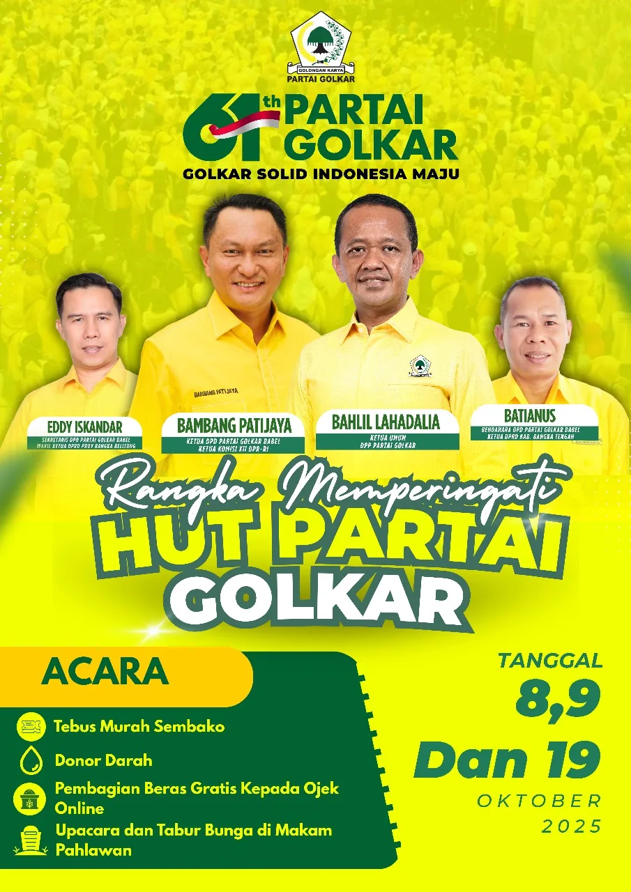 Seputarbabel.com, Pangkalpinang-Dalam rangka memperingati Hari Ulang Tahun (HUT) ke-61 Partai Golkar, Dewan Pimpinan Daerah (DPD) Partai Golkar Provinsi Kepulauan Bangka Belitung (Babel) menyiapkan serangkaian kegiatan sosial yang menyentuh langsung kebutuhan masyarakat.