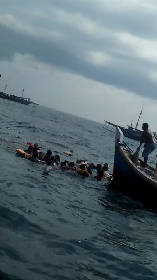 Tiba-tiba lewat sebuah kapal dengan gas penuh sehingga menyebabkan sampan dengan muatan penumpang sekitar 20-25 Orang dan 2 ABK yang kami gunakan terbalik dan tenggelam.