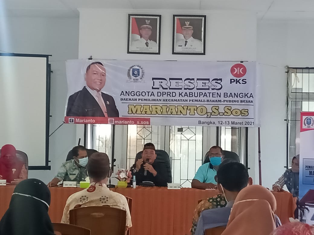 Bangka, Seputarbabel.com — Anggota Dewan Perwakilan Rakyat Daerah (DPRD) Kabupaten Bangka dari Partai keadilan Sejahtera (PKS ) Marianto S.Sos Daerah pemilihan (dapil) Puding besar,Pemali dan Bakam melakukan Reses tahun 2021 untuk menampung aspirasi masyarakat,Jumat(12/3/21)