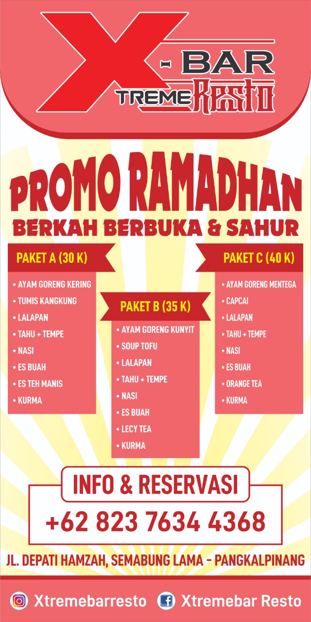 Selama Ramadhan, nikmati promo Paket Ramadhan Xtreme-Bar dan Resto seharga Rp. 30.000,-Rp. 35.000,- /orang.
