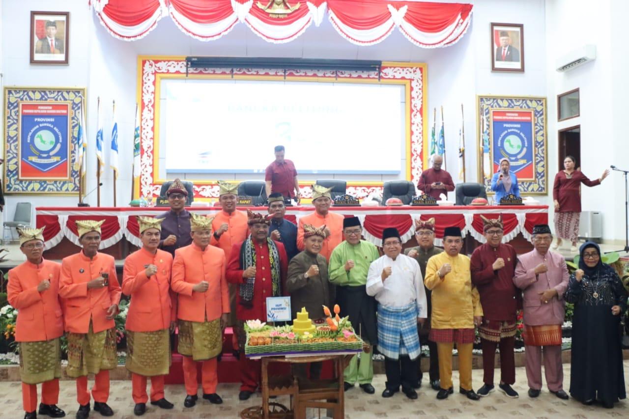 Sidang istimewa Peringatan Hari Jadi Prov. Kep. Babel berlangsung khidmat, didampingi seluruh pejabat Forkopimda, Pj Gubernur Safrizal menerima potongan tumpeng pertama dari Ketua DPRD Kep. Babel, Herman Suhadi sebagai tanda sinergi Pemerintah Provinsi dengan Masyarakat, membangun Bumi Serumpun Sebalai