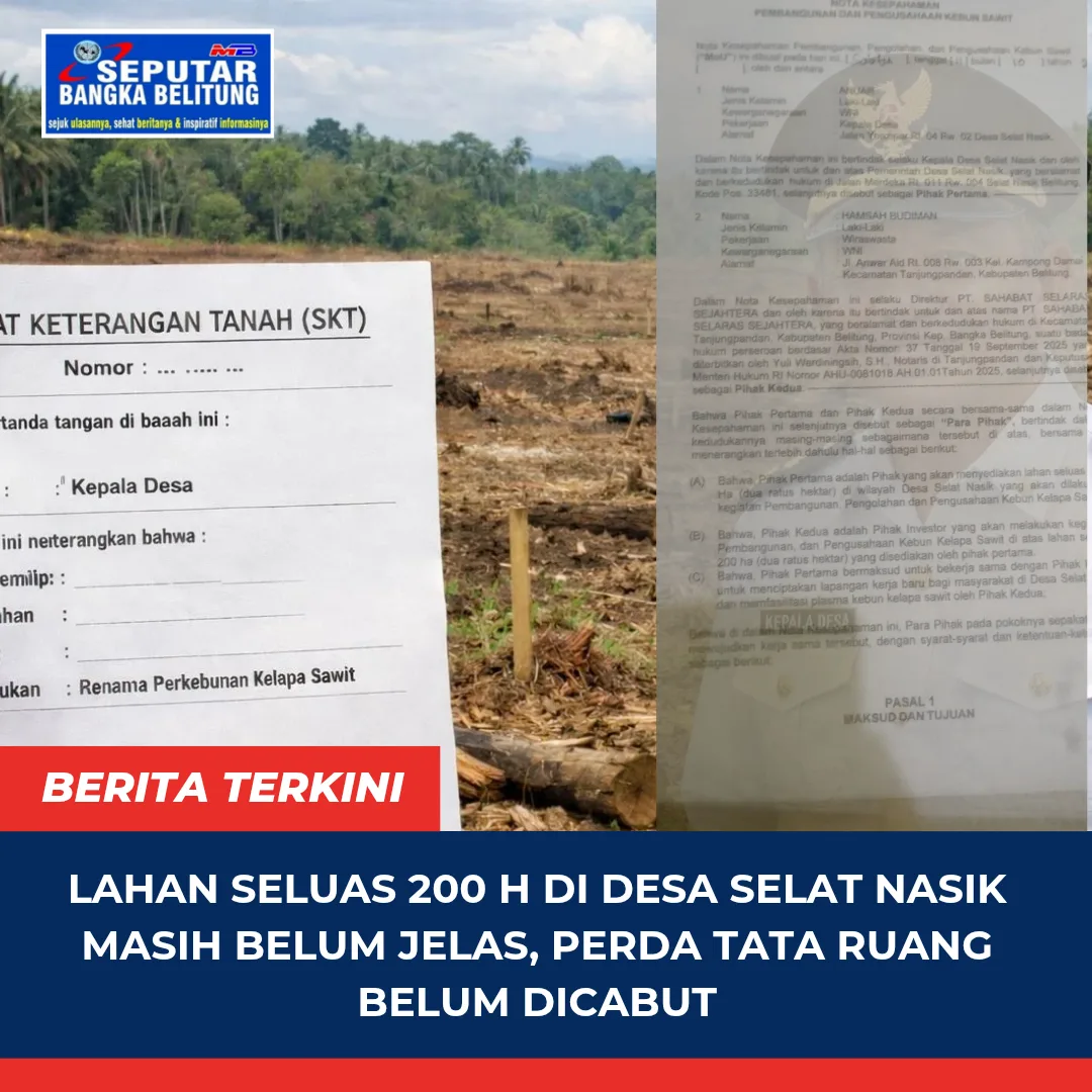 SEPUTARBABEL. COM, BELITUNG – Sebuah nota kesepakatan antara Kepala Desa Selat Nasik, Anwar, dan Direktur PT Sahabat Selaras Sejahtera, Hamsa Budiman beredar, hal tersebut telah memicu kecurigaan masyarakat. Sabtu (21/2/2026).