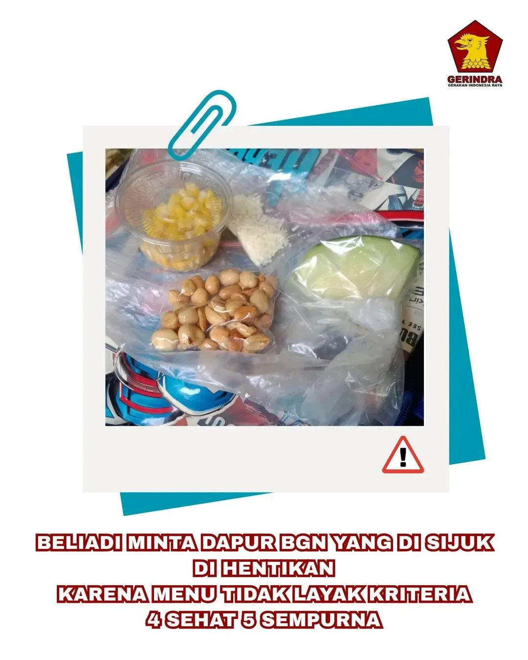 Dalam unggahannya di akun Facebook, Beliadi menuliskan, “Aga dapur SPPG Sijuk dihentikan penyajiannya. Menu-menu yang disajikan tidak layak dan tidak sesuai dengan standar 4 sehat 5 sempurna.”